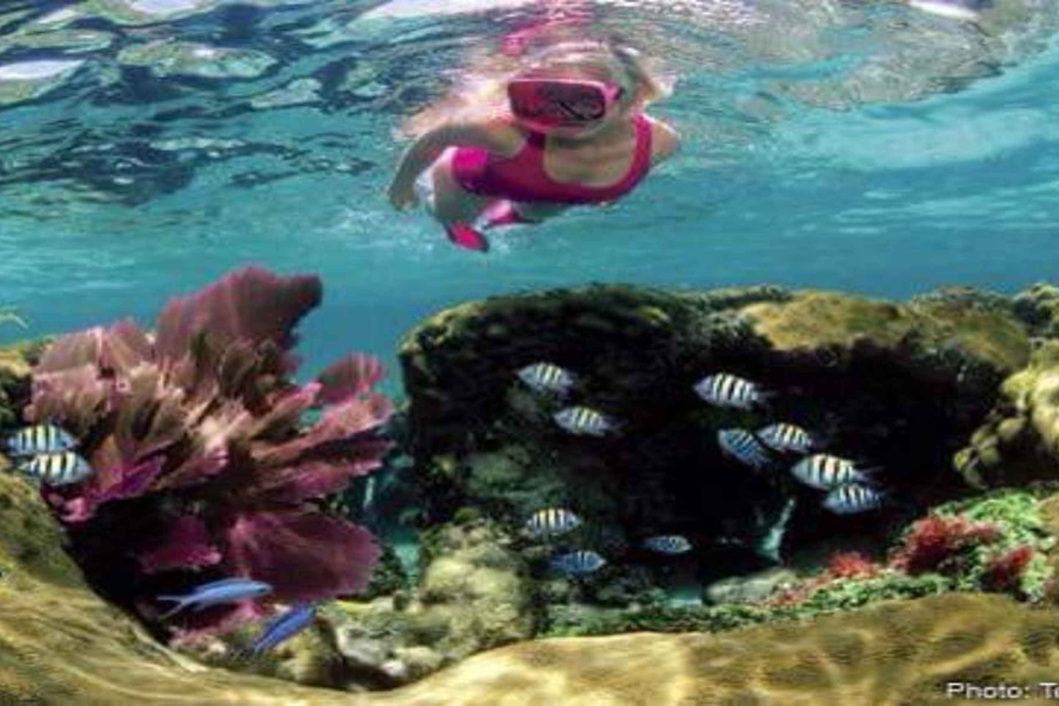 Once there, swim, sunbathe, and snorkel among colorful coral reefs and a wide variety of tropical fish. Feed them with the fruit and bread provided.