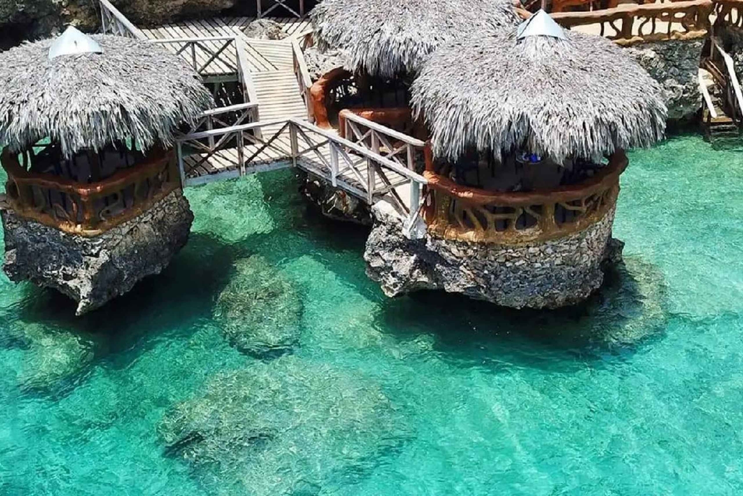 Descendez un escalier en bois directement dans l'eau salée cristalline, ce qui vous permettra de vous baigner sans avoir à sauter. Marchez le long d'une promenade en bois qui s'étend au-dessus de l'océan jusqu'à Frico Beach, une étendue de sable privée bordée de chaises longues pour bronzer et se détendre.