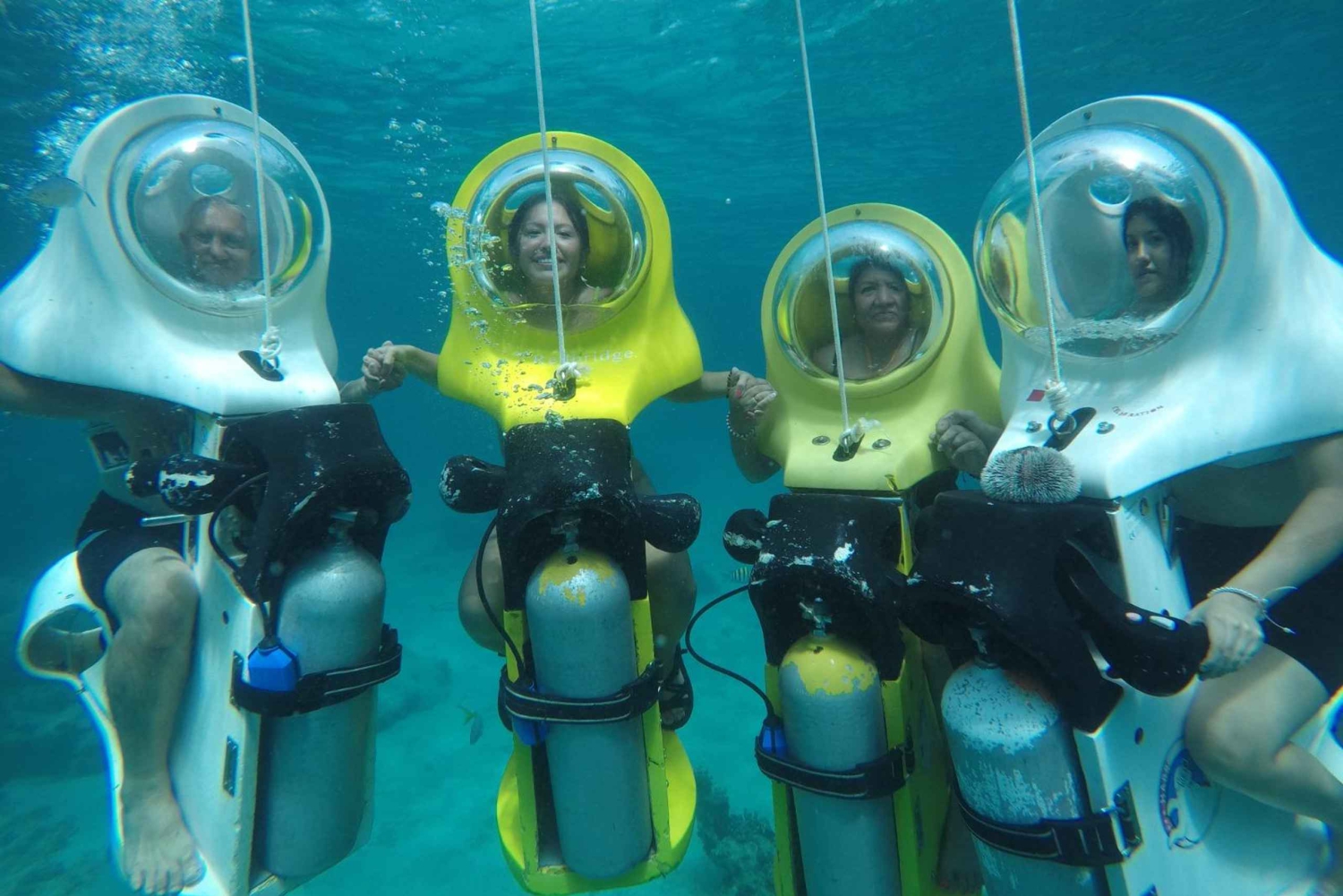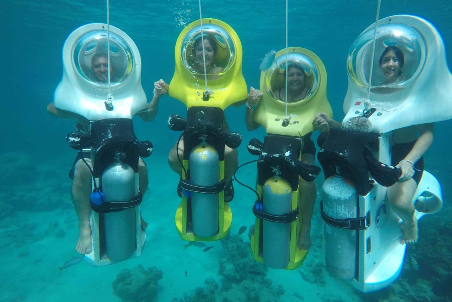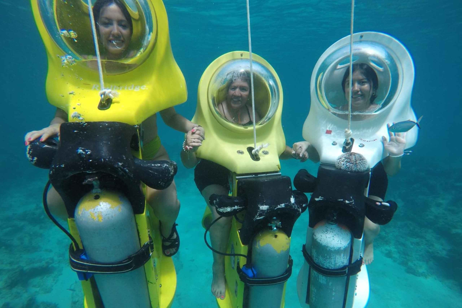 Durante la tua avventura ScubaDoo, avrai l'opportunità di vedere una grande varietà di vita marina, tra cui pesci colorati, coralli e persino relitti di navi. Le guide sono esperte e ti porteranno nei punti migliori per ottenere la massima visibilità e avvistare la fauna marina. Non importa se il cliente non ha conoscenze pregresse di immersioni o scooter, poiché l'interfaccia del nostro Scuba doo o Scuba bike è progettata per essere utilizzata da bambini di 10 anni fino ad adulti di oltre 70 anni.